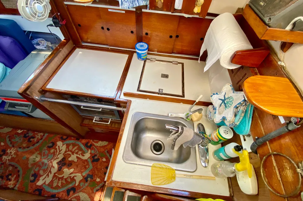 Removed kerosene heater and stove and replaced stove with Origo non pressurized alcohol stove and oven. (we had a fire in the stove in 2020 which affected the stove’s appearance but not it’s function, the oven was not affected)