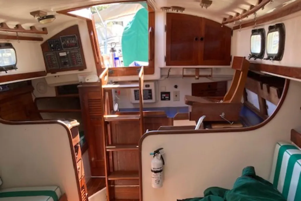 Nav station to starboard. Seat area could be configured as a pilot berth.